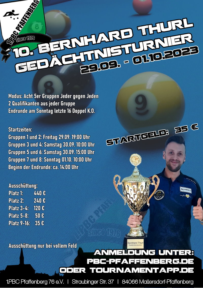 10. Bernhard Thurl Gedächtnis TurnierFreitag, 29. September - Sonntag, 01. Oktober 2023 |