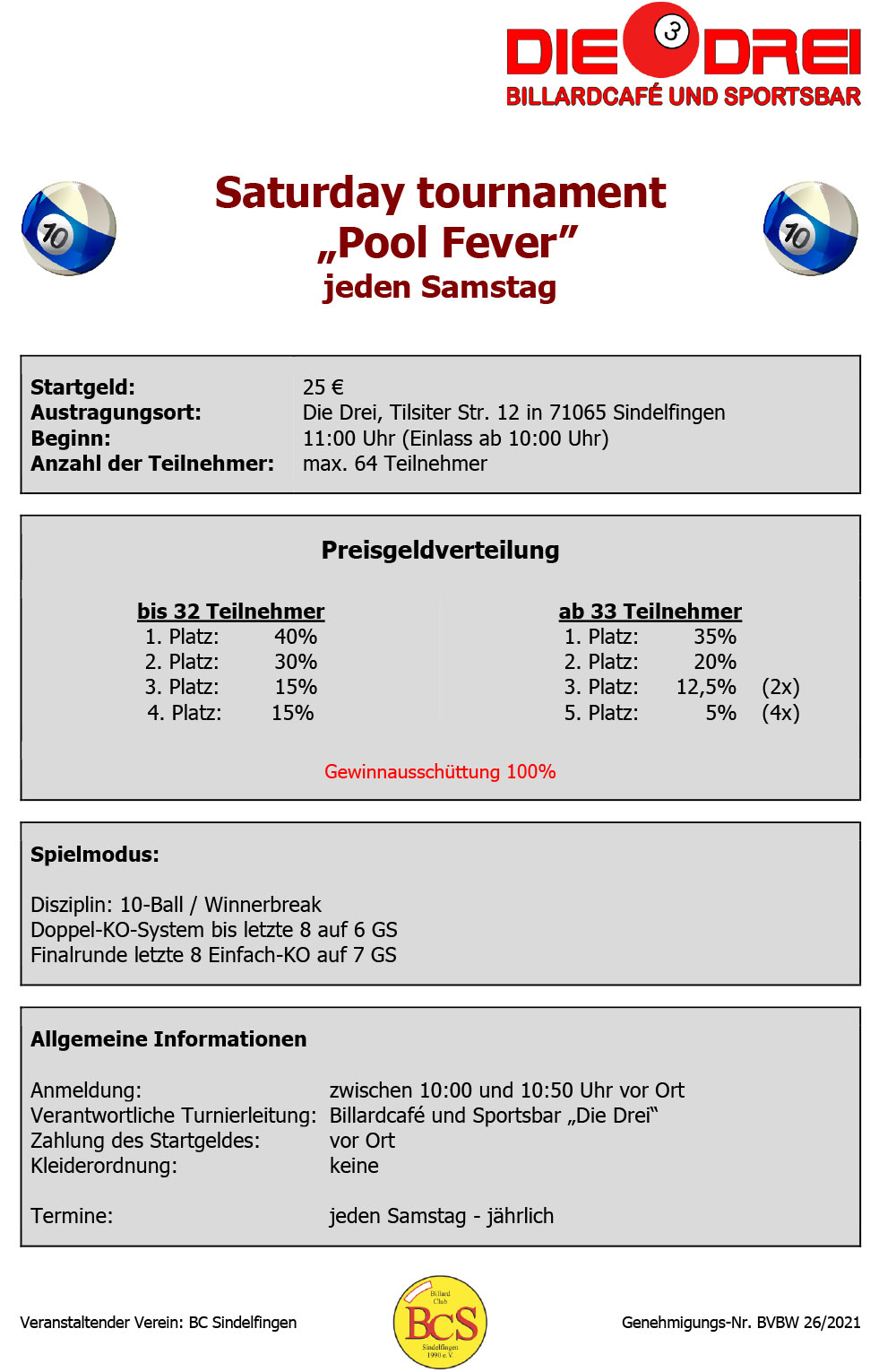 Saturday tournament "Pool Fever"Samstag, 18. Dezember 2021 |