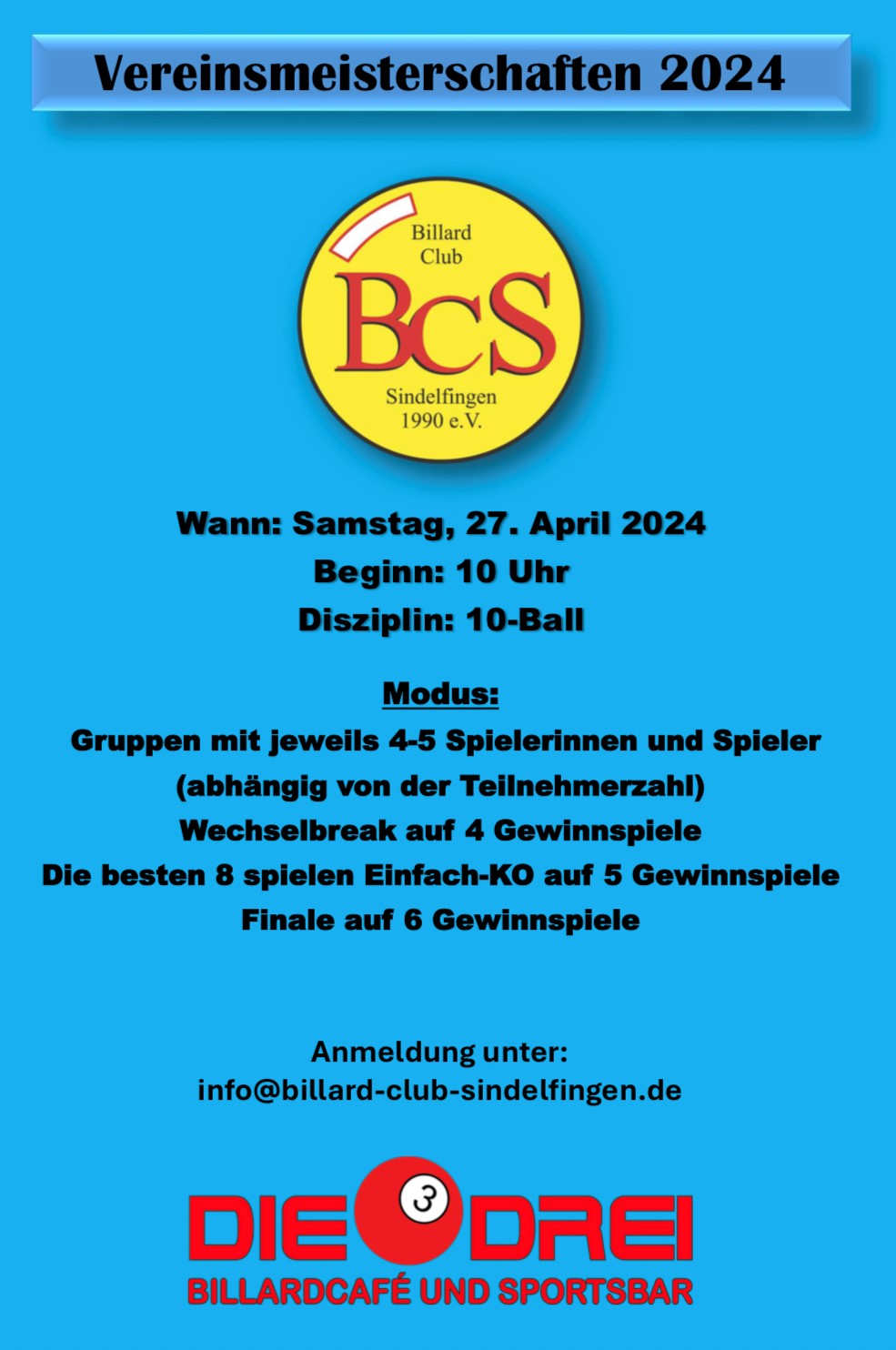 Vereinsmeisterschaften BC Sindelfingen 10-BallSamstag, 27. April 2024 |