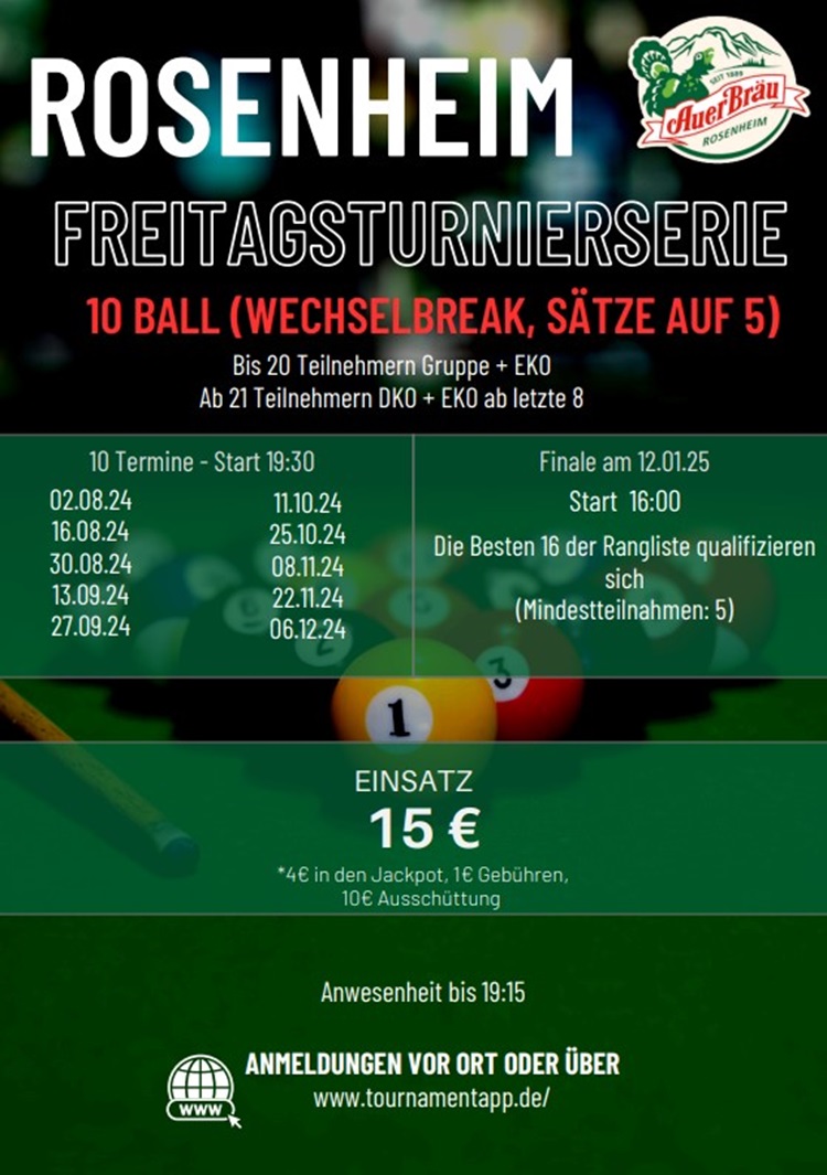 | Spielort | Billardverein Rosenheim Klepperstr. 18b 83026 Rosenheim |