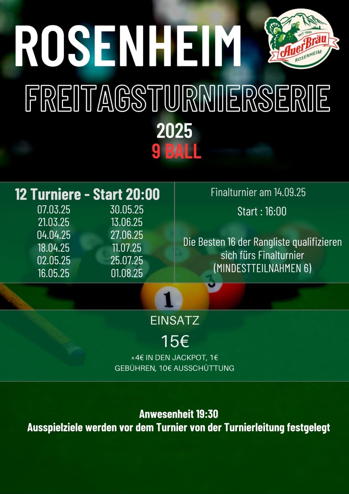 | Spielort | Billardverein Rosenheim Klepperstr. 18b 83026 Rosenheim |