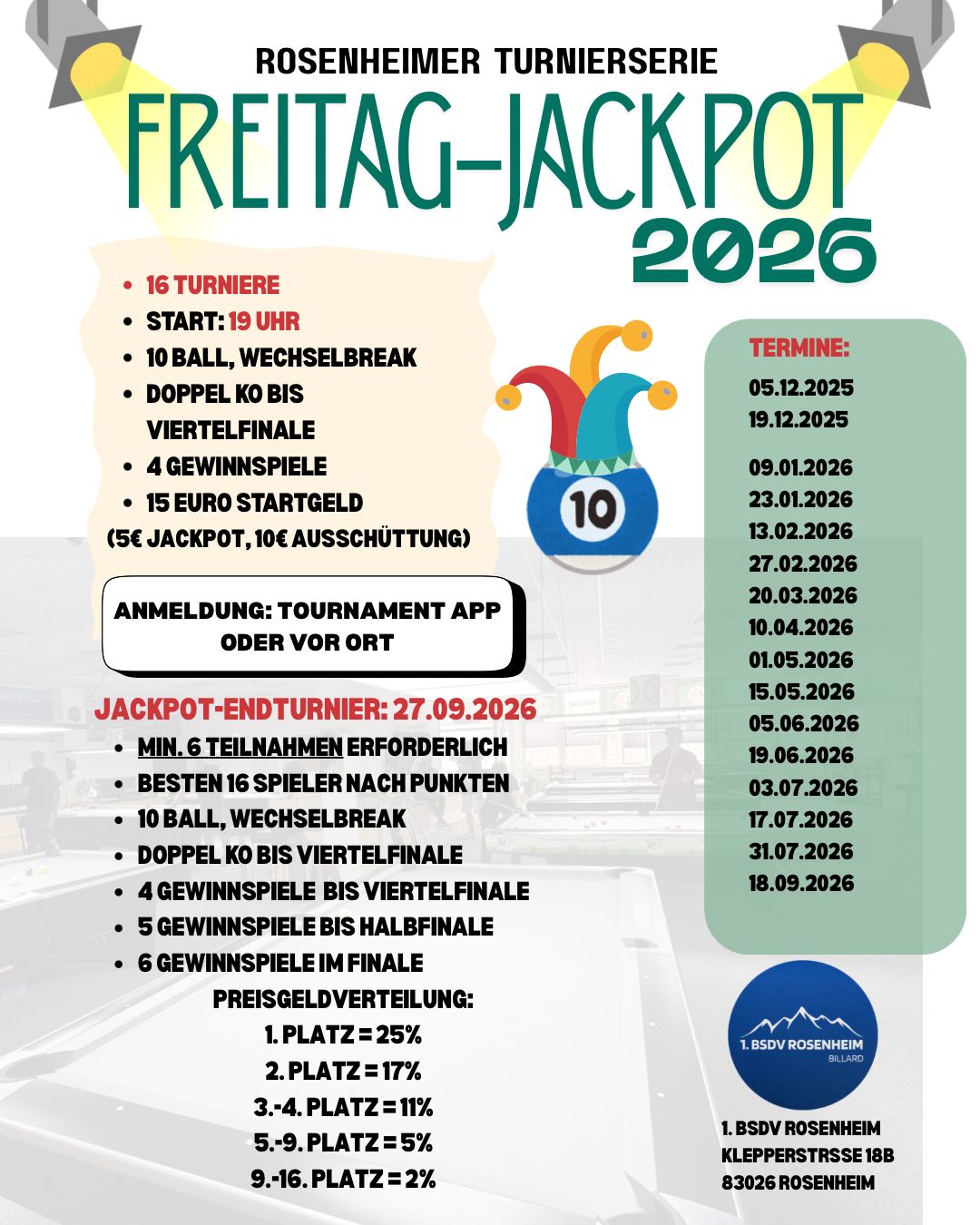 | Spielort | Billardverein Rosenheim Klepperstr. 18b 83026 Rosenheim |