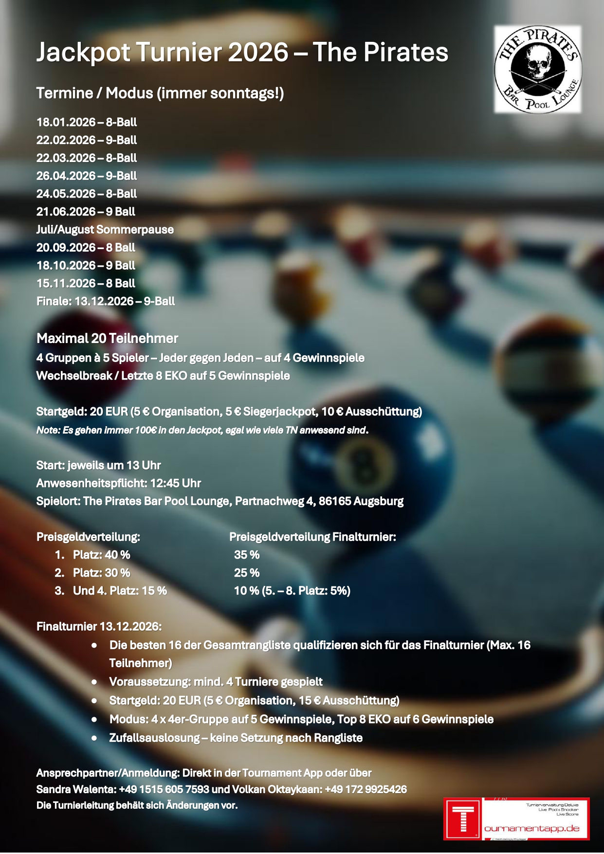 | Spielort | The Pirates Bar Pool Lounge Partnachweg 4, 86165 Augsburg |