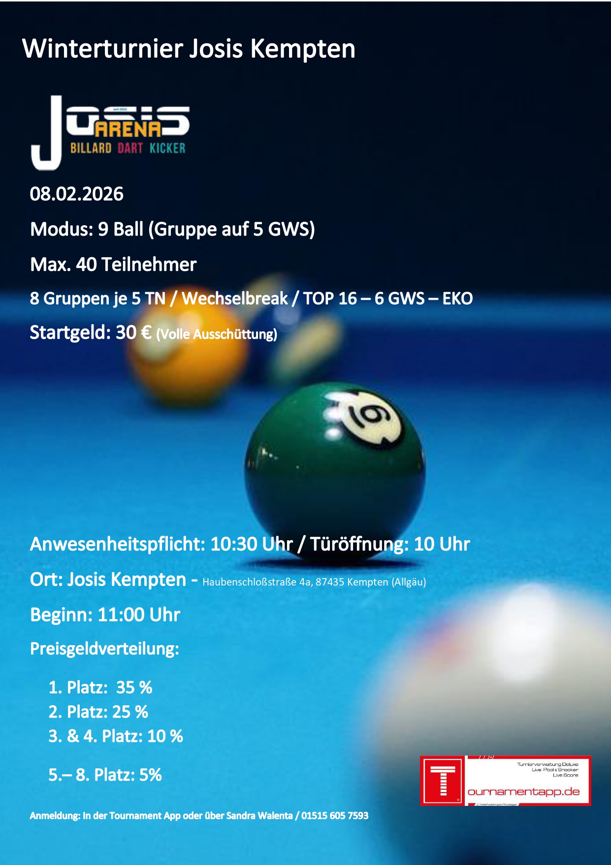 | Spielort | Josis Billard Arena Haubenschloßstraße 4a 87435 Kempten im Allgäu |