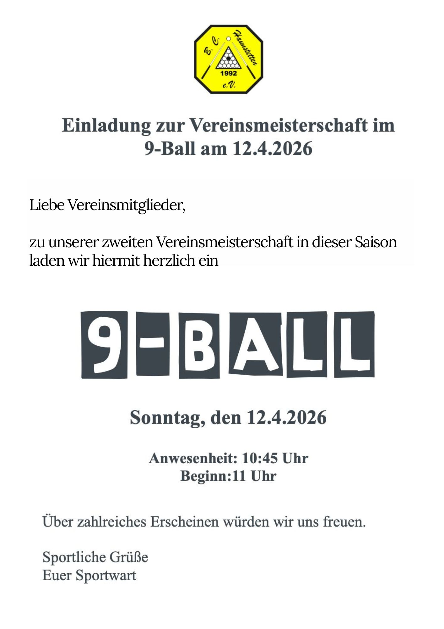 Vereinsmeisterschaft 9-Ball (Intern) BC Haunstetten 1992 e.V.Sonntag, 12. April 2026 |