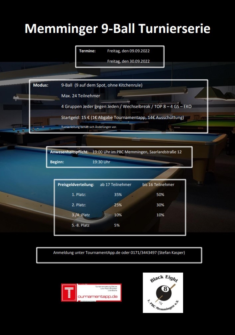 Memminger 9-Ball TurnierserieFreitag, 30. September 2022 |
